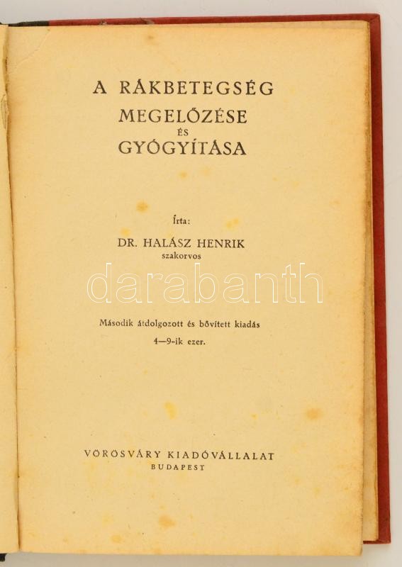 Halász Henrik: A rákbetegség megelőzése és gyógyítása. Bp., é. n., Vörösváry. Félvászon kötésben, jó állapotban.