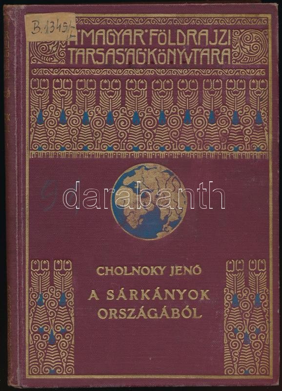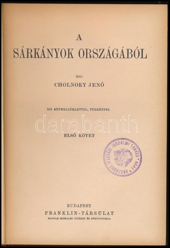 Cholnoky Jenő: A sárkányok országából I. kötet. Magyar Földrajzi Társaság Könyvtára. Bp., é.n., Franklin-Társulat. Fekete-fehér fotókkal, szövegközti illusztrációkkal. Kiadói aranyozott egészvászon sorozatkötésben, kopottas borítóval, intézményi bélyegzővel.