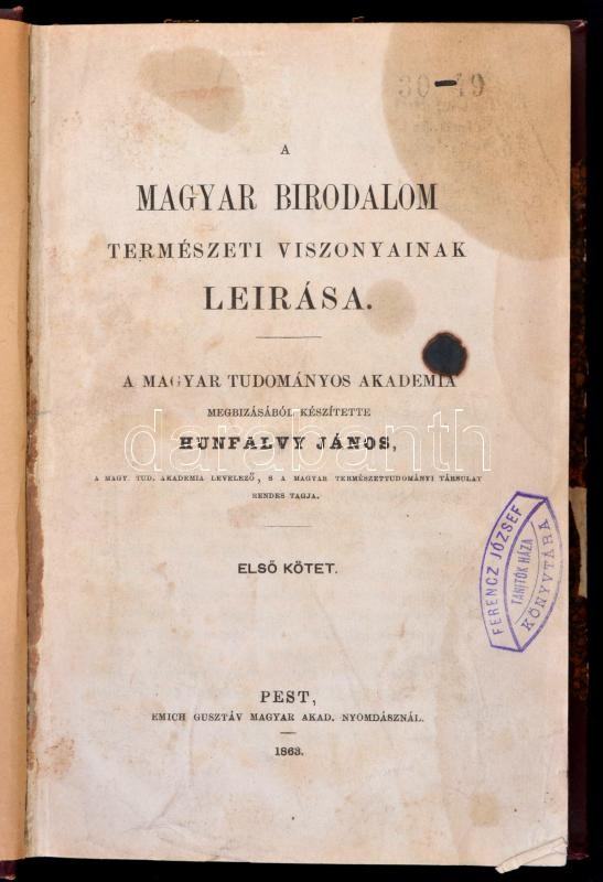 Hunfalvy János: A Magyar Birodalom természeti viszonyainak leírása. I. kötet. Pest, 1863, Emich Gusztáv, IV+336 p. Átkötött félvászon-kötés, foltos. Hiányos, 336. oldalnál véget ér a könyv.
