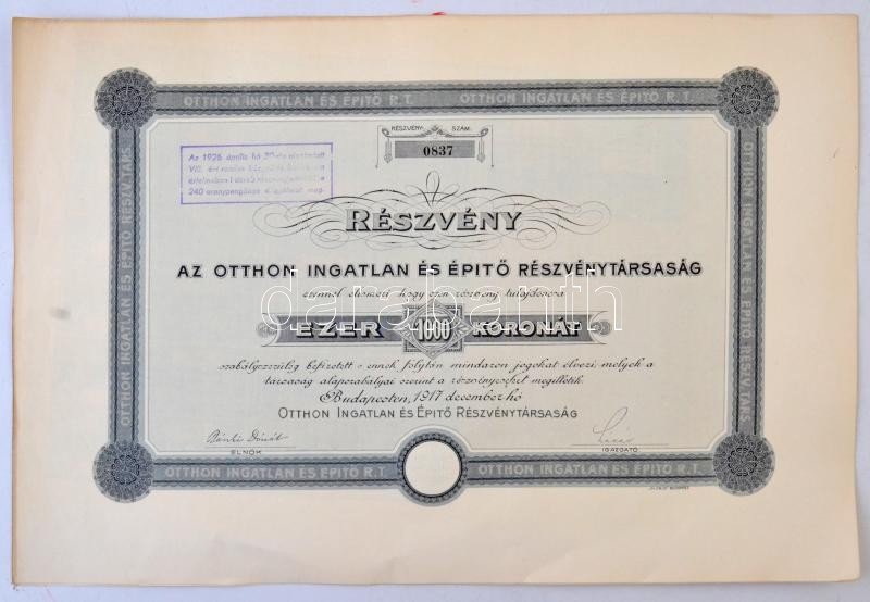 Budapest 1917. "Az Otthon Ingatlan és Építő Részvénytársaság"... https://www.darabanth.com/de/329-Fernauktion/329.0/Numismatik/Aktien-und-Tickets~2500005/Budapest-1917-Az-Otthon-Ingatlan-es-Epito-Reszvenytarsasag-reszvenye-1000K-rol-felulb~II1838826