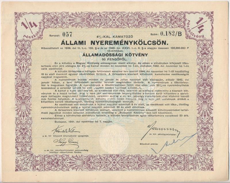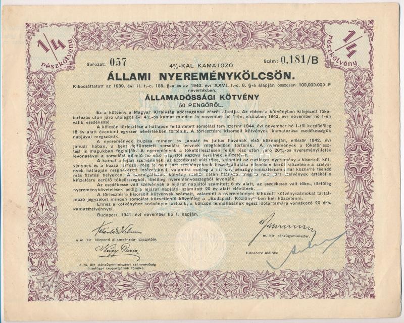 Budapest 1941. "4%-kal kamatozó Állami Nyereménykölcsön" áll... https://www.darabanth.com/de/329-Fernauktion/329.0/Numismatik/Aktien-und-Tickets~2500005/Budapest-1941-4-kal-kamatozo-Allami-Nyeremenykolcson-allamadossagi-kotvenye-50P-rol-~II1810599
