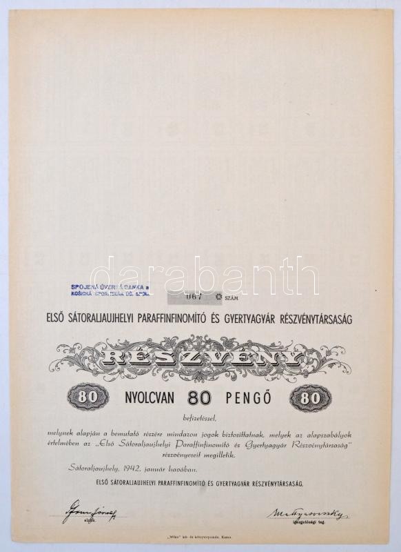 Beschreibung: Sátoraljaújhely 1942. "Első Sátoraljaújhelyi Paraffinfinomító és Gyertyagyár Részvénytársaság" részvénye 80P-ről szelvényekkel T:I