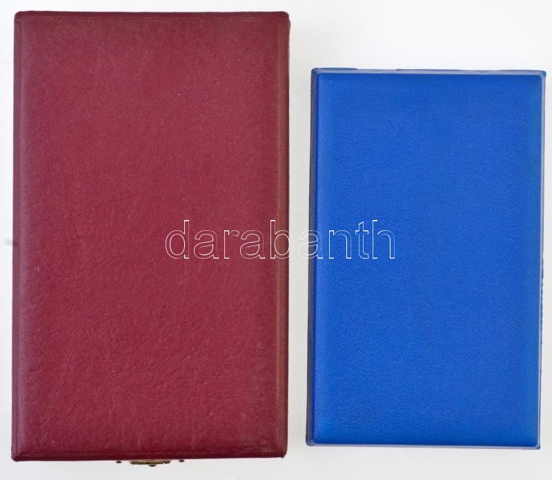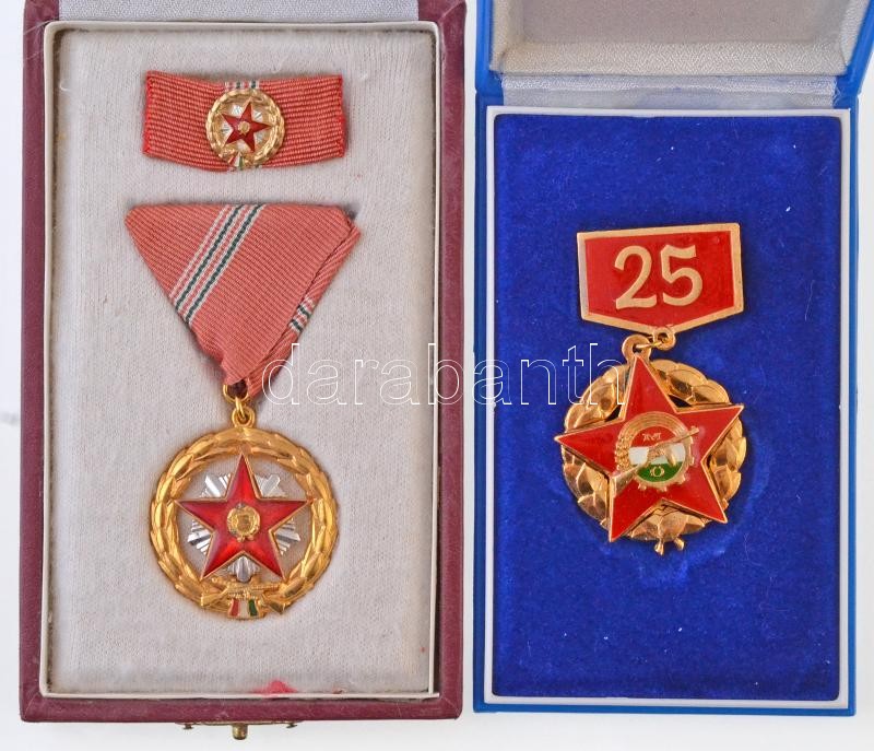 Beschreibung: 1964. "Kiváló Szolgálatért Érdemrend" aranyozott, zománcozott Br kitüntetés mellszalagon, miniatűrrel és szalagsávval, dísztokban + ~1970. "Munkásőr - 25 év" aranyozott, zománcozott jelvény, sérült tokban T:1-