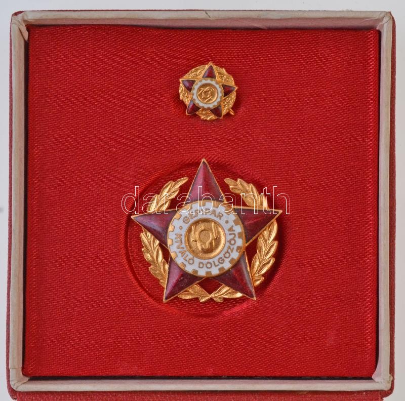 ~1960-1970. "Gépipar Kiváló Dolgozója" zománcozott fém jelvény és miniatűr, eredeti tokban T:1-