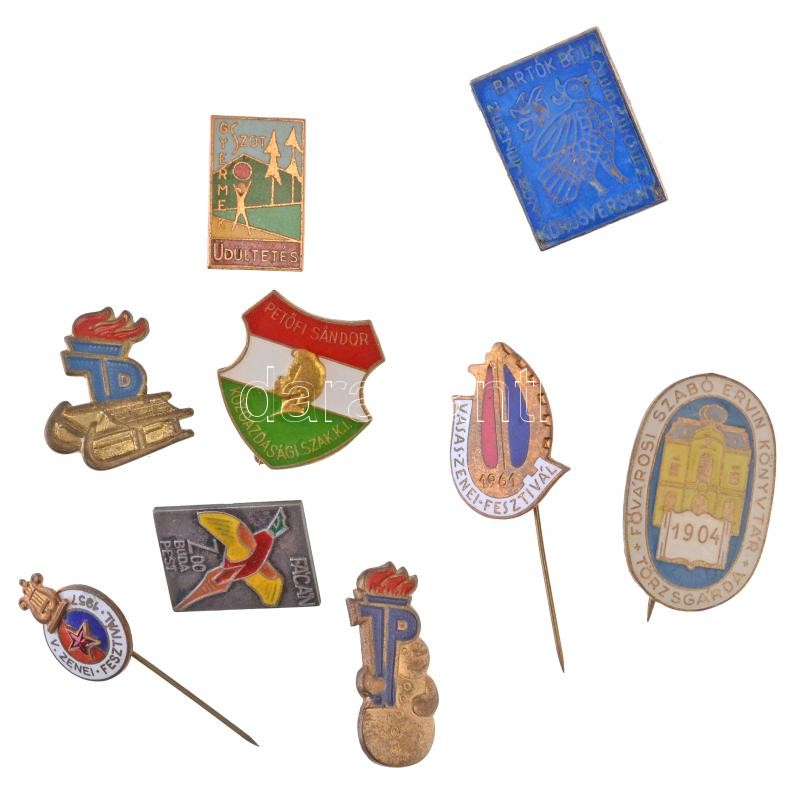 9db-os vegyes, főleg magyar jelvény és kitűző tétel, nagyrésze a szocialista korszakból, közte "Petőfi Sándor Mezőgazdasági Szak. K. I.", "Bartók Béla Nemzetközi Kórusverseny Debrecen", "SZOT Gyermek Üdültetés" T:2,2-