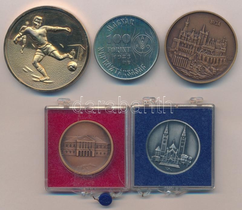 Vegyes: 5db-os emlékérem és pénzérme tétel, közte Olaszország 1996. "PERSONAL JET ROMA - COPPA UEFA - KARLSRUHE-ROMA 15/10/96" aranyozott fém labdarúgó díjérem T:vegyes