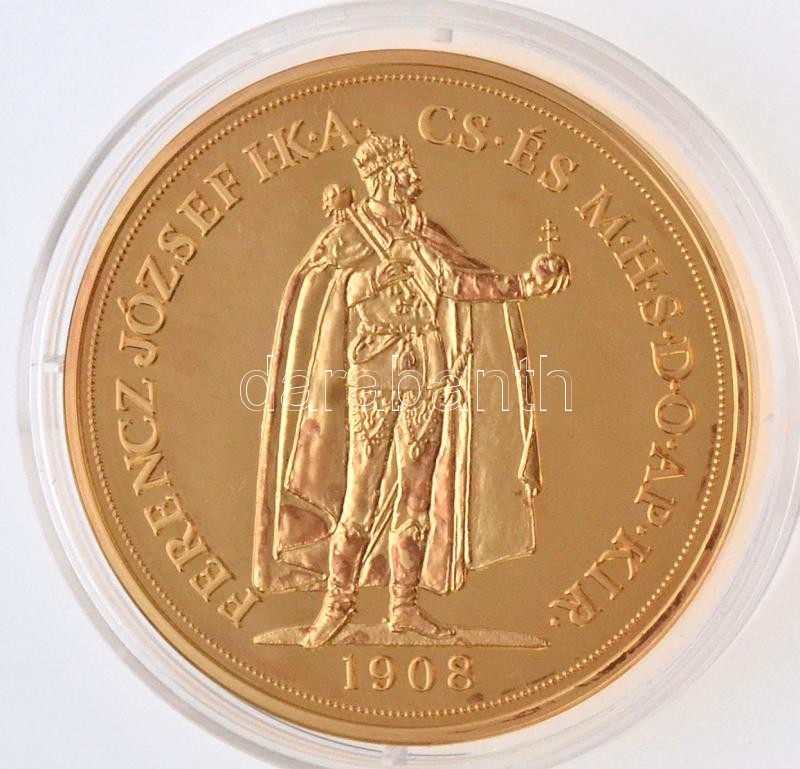 DN "Történelmi aranypénzek - Ferenc József 100 Korona 1908" ... https://www.darabanth.com/de/329-Fernauktion/329.0/Numismatik/Moderne-Beischlage-Fantasiemunzen~2500010/DN-Tortenelmi-aranypenzek-Ferenc-Jozsef-100-Korona-1908-aranyozott-Cu-Ni-utanveret-COPY-b~II1834216