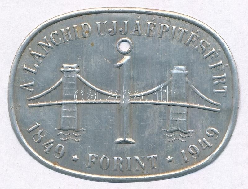 1949. 1Ft "A Lánchíd ujjáépítéséért 1849-1949" Al bárca T:2 https://www.darabanth.com/de/329-Fernauktion/329.0/Numismatik/Notgeld-aus-Papier-und-Metall~2500006/1949-1Ft-A-Lanchid-ujjaepiteseert-1849-1949-Al-barca-T2~II1836167