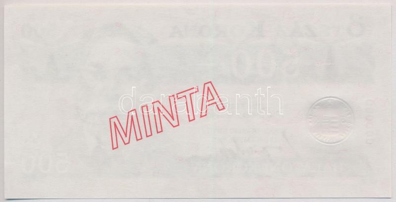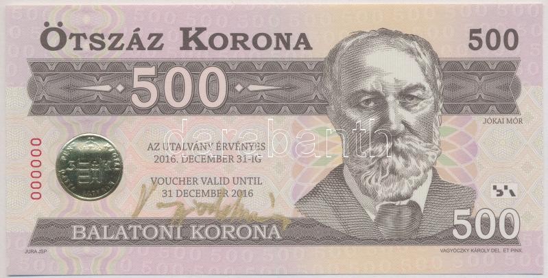 2012. 500K "Balatoni Korona" helyi pénz, "000000" sorszámmal, csak előlapi nyomat, hátoldalán "MINTA" felülbélygzés. A tervező, Vagyóczky Károly aláírásával T:I