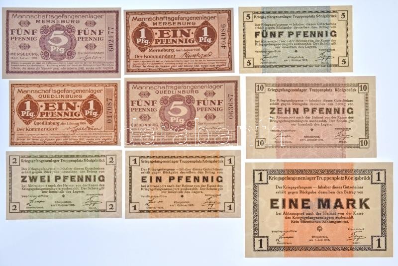 Német Birodalom / Königsbrück hadifogolytábor 1915. 1pf + 2pf + 5pf + 10pf + 1918. 1M + Merseburg hadifogolytábor 1916. 1pf + 1918. 5pf + Quedlinburg hadifogolytábor 1916. 1pf + 5pf T:I German Empire / Königsbrück POW camp 1915. 1 Pfennig + 2 Pfennig + 5 Pfennig + 10 Pfennig + 1918. 1 Mark + Merseburg POW camp 1916. 1 Pfennig + 1918. 5 Pfennig + Quedlinburg POW camp 1916. 1 Pfennig + 5 Pfennig C:UNC