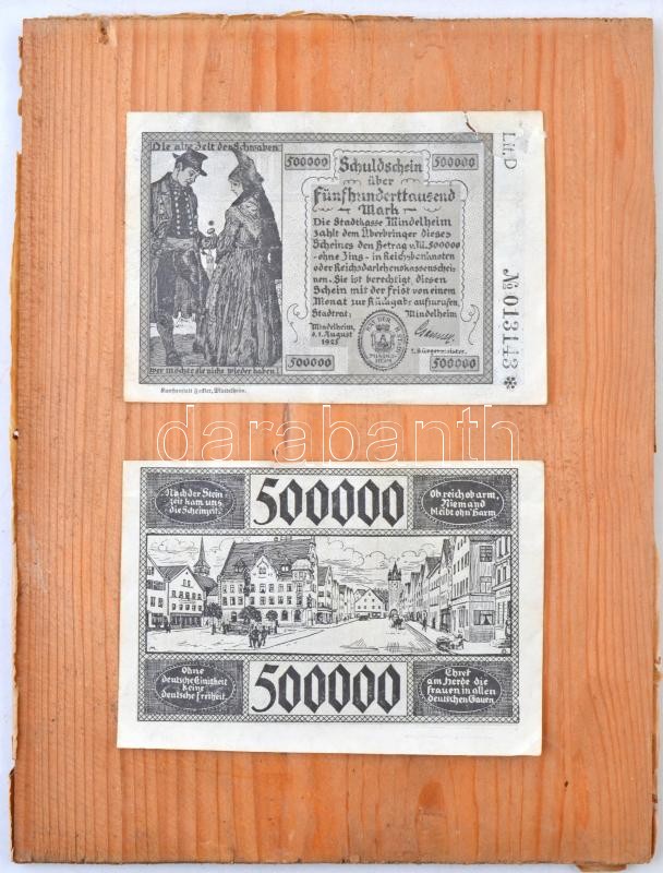 Németország / Weimari Köztársaság / Mindelheim 1923. 500.000M (2x) szükségpénz, sérült fa alapra ragasztva T:III,III- szakadás German / Weimar Republic / Mindelheim 1923. 500.000 Mark (2x) necessity notes, glued to damaged wood frame C:F,VG tear