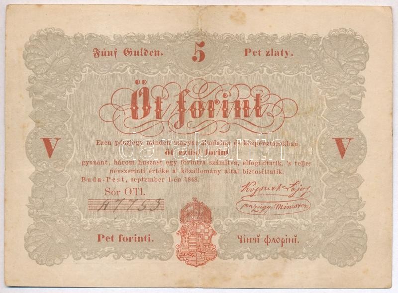 1848. 5Ft "Kossuth bankó" vörösesbarna T:III Adamo G109 https://www.darabanth.com/de/329-Fernauktion/329.0/Numismatik/Ungarische-Banknoten~2500007/1848-5Ft-Kossuth-banko-vorosesbarna-TIII-Adamo-G109~II1838680