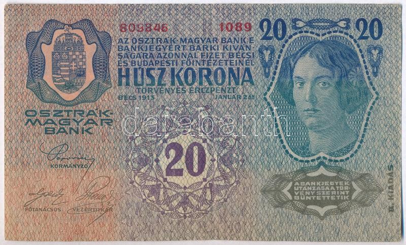 1913. 20K II. kiadás T:II https://www.darabanth.com/de/329-Fernauktion/329.0/Numismatik/Ungarische-Banknoten~2500007/1913-20K-II-kiadas-TII~II1807844
