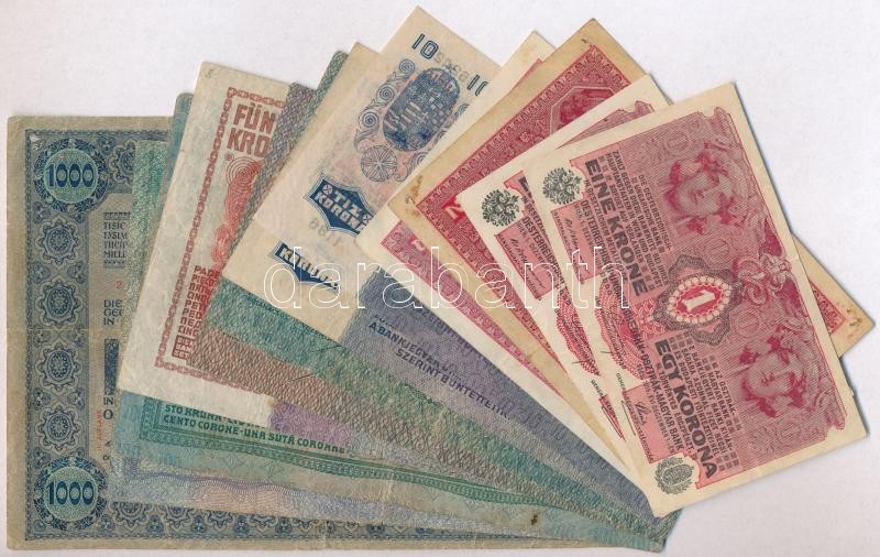 Beschreibung: 1916. 1K (2x) egyik "DEUTSCHÖSTERREICH" felülbélyegzéssel + 1917. 2K (2x) egyik "DEUTSCHÖSTERREICH" felülbélyegzéssel + 1915. 10K (2x) egyik "DEUTSCHÖSTERREICH" felülbélyegzéssel + 1913. 20K (2x) egyik II. kiadású, "DEUTSCHÖSTERREICH" felülbélyegzéssel + 1914. 50K "DEUTSCHÖSTERREICH" felülbélyegzéssel + 1912. 100K (2x) egyiknek mindkét oldala német nyelvű, "DEUTSCHÖSTERREICH" felülbélyegzéssel + 1902. 1000K rajzos hátlapú, német nyelvű, "DEUTSCHÖSTERREICH" felülbélyegzéssel T:III,III- ly.