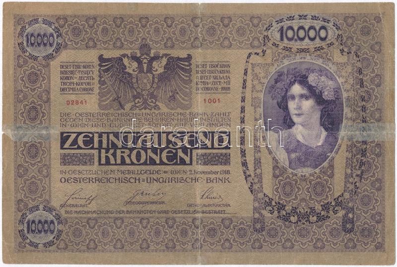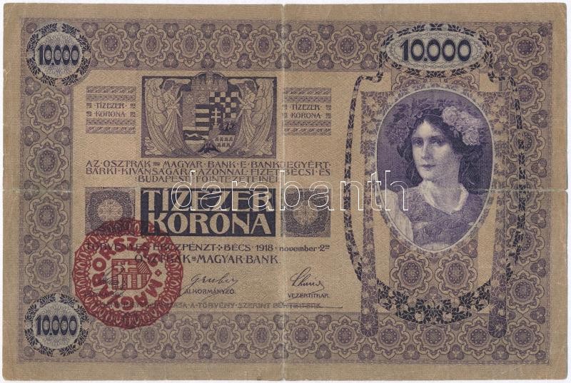 1918. 10.000K piros "MAGYARORSZÁG" felülbélyegzéssel T:III- ... https://www.darabanth.com/de/329-Fernauktion/329.0/Numismatik/Ungarische-Banknoten~2500007/1918-10000K-piros-MAGYARORSZAG-felulbelyegzessel-TIII-ragasztott-Adamo-K40~II1833124