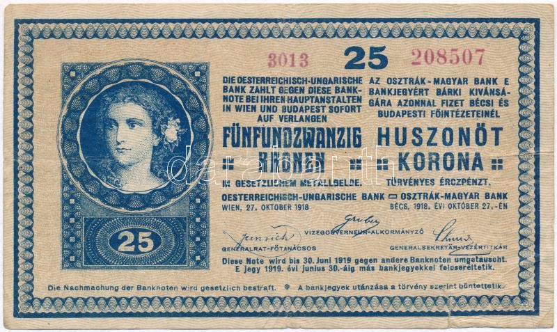 Beschreibung: 1918. 25K "3013" hullámos hátlappal, eltérő méretű sorozat és sorszámmal T:III szakadás