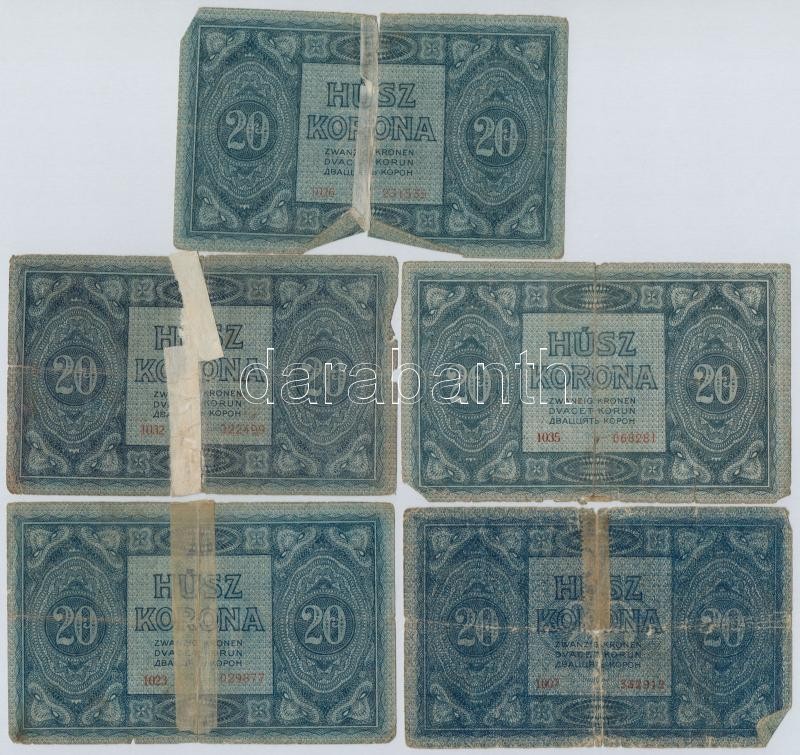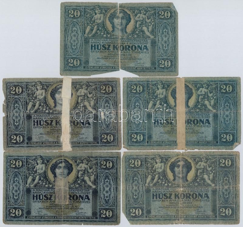 1919. július 15. 20K (5x) T:IV mind ragasztott https://www.darabanth.com/de/329-Fernauktion/329.0/Numismatik/Ungarische-Banknoten~2500007/1919-julius-15-20K-5x-TIV-mind-ragasztott~II1836416
