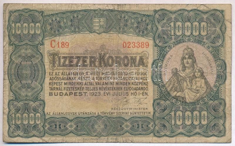 1923. 10.000K "Magyar Pénzjegynyomda Rt. Budapest" T:III- https://www.darabanth.com/de/329-Fernauktion/329.0/Numismatik/Ungarische-Banknoten~2500007/1923-10000K-Magyar-Penzjegynyomda-Rt-Budapest-TIII-~II1839084