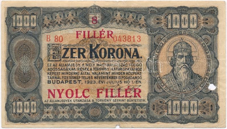 1923. 1000K "8 FILLÉR - NYOLC FILLÉR" felülnyomással, nyomda... https://www.darabanth.com/de/329-Fernauktion/329.0/Numismatik/Ungarische-Banknoten~2500007/1923-1000K-8-FILLER-NYOLC-FILLER-felulnyomassal-nyomdahely-jeloles-nelkul-TIII-III-a~II1833081