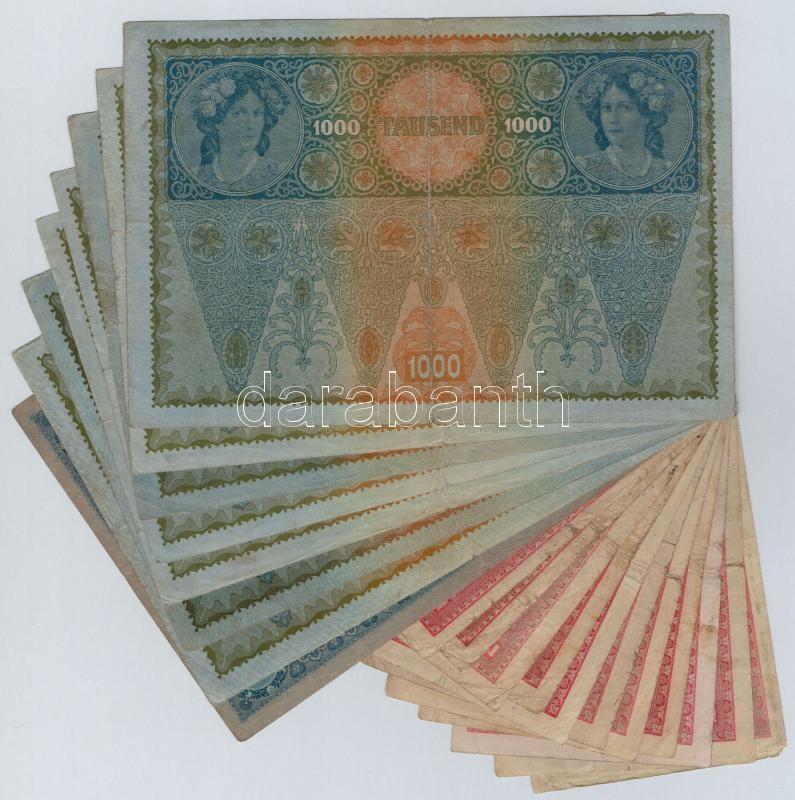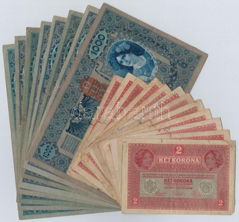 Beschreibung: ~1920. 20db-os korona bankjegy tétel, közte 1902. 1000K mindkét oldala német nyelvű szöveggel illetve rajzolt hátlapú darabok T:III,III-