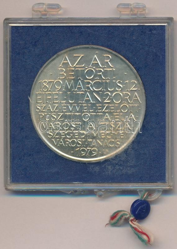 Lapis András (1942-) 1979. "Az ár betört! 1879 Március 12 éjfél után 2 óra - Száz évvel ezelőtt pusztította el a várost a Tisza - Szeged Megyei Városi Tanács" jelzett Ag emlékérem, plombált műanyag tokban (35g/0.835/42,5mm) T:1 patina