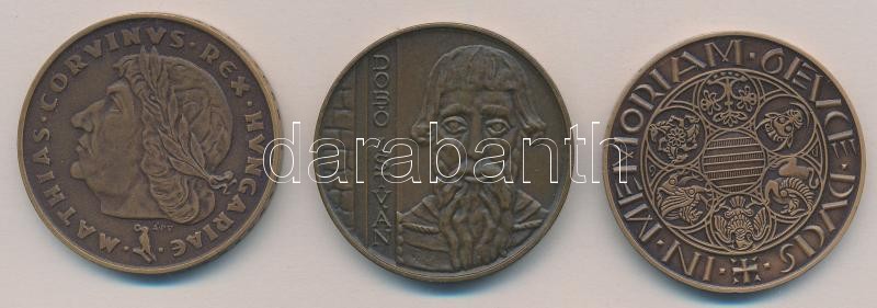 Csúcs Ferenc (1905-1999) 1974. "MÉE Budapest - Mátyás király - Mathias Corvinus Rex Hungarie / Buda" Br emlékérem (42,5mm), Képíró Zoltán (1944-1981) 1977. "MÉE VIII. Vándorgyűlése - Eger / Dobó István" Br emlékérem (42,5mm), Peternák Gusztáv (1928-) 1988. "MÉE Budapest / Hungarie Strigonium Metropolis" Br emlékérem (42,5mm) T:1-
