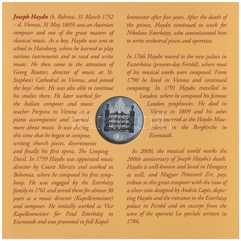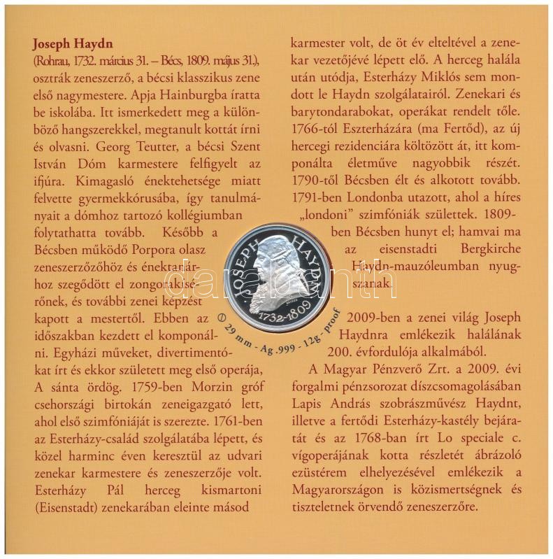 Beschreibung: 2009. 5Ft-200Ft "Haydn" (7xklf) forgalmi érme sor, benne "Joseph Haydn" Ag emlékérem (12g/0.999/29mm) T:PP