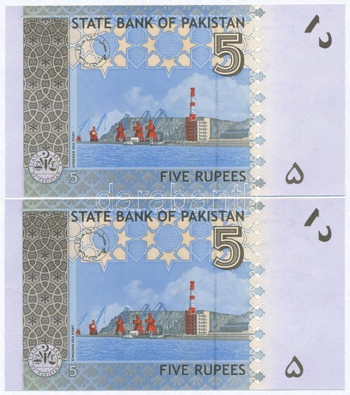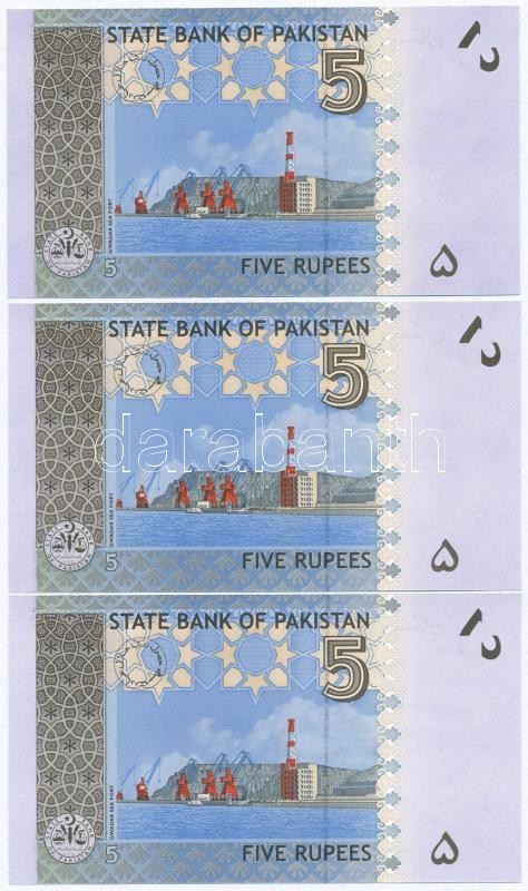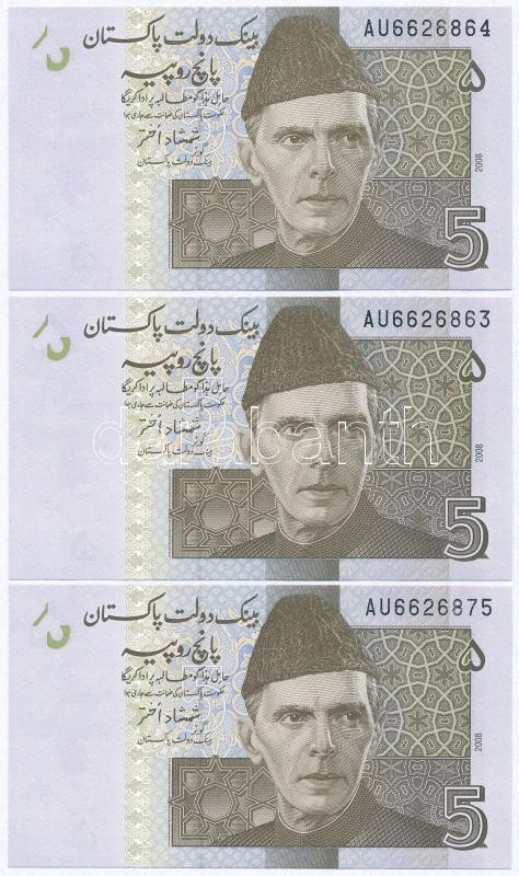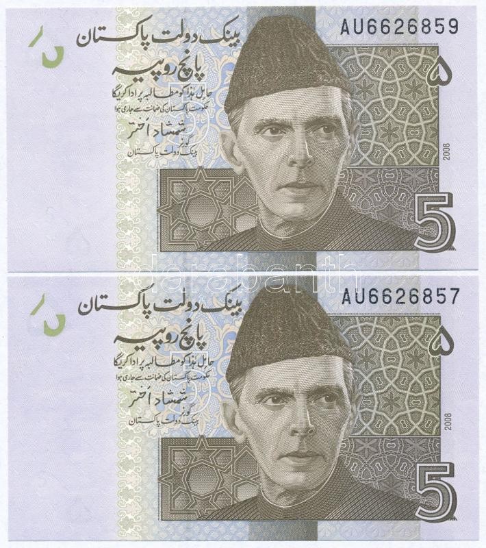 Pakistan 2008. 5 Rupees (5x) including 2pcs of sequential serials and 2pcs of close serials C:UNC,AU