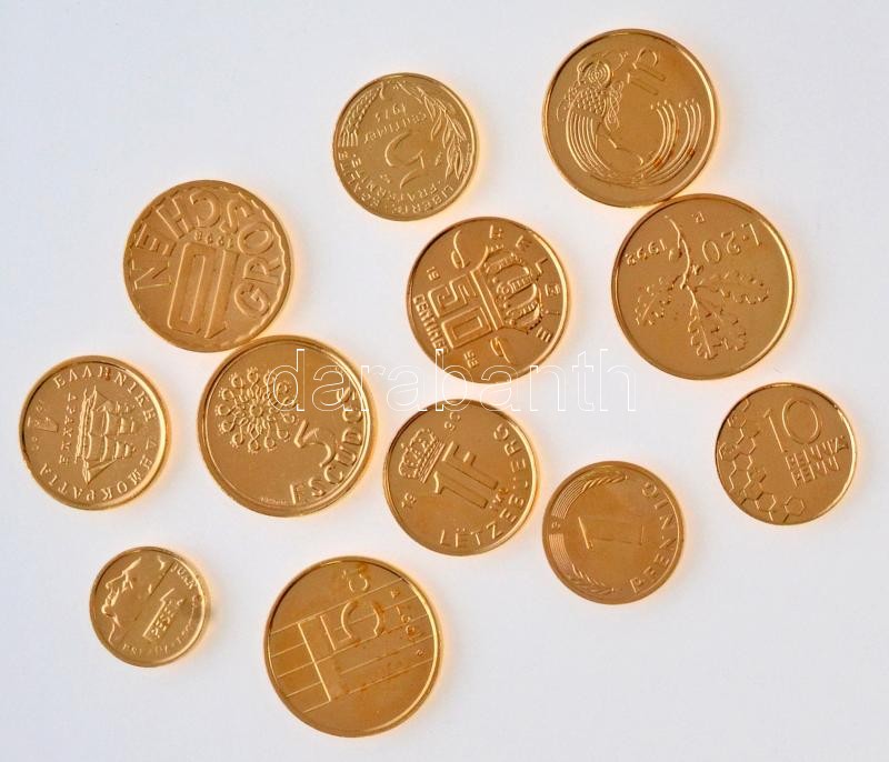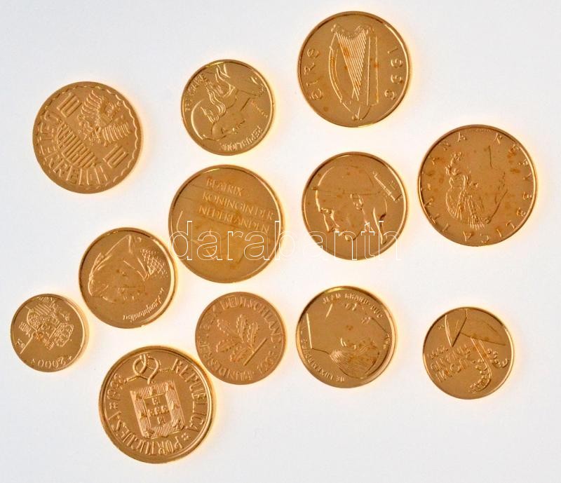12db-os vegyes aranyozott forgalmi érme tétel, közte Írország, Portugália, Luxemburg, Hollandia T:1,1- 12pcs of various gold plated coins, including Ireland, Portugália, Luxembourg, Netherlands C:UNC,AU