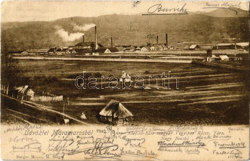 Beschreibung: 1902 Nagybocskó, Velikij Bicskiv, Velykyy Bychkiv (Máramaros, Maramures); Klotild Első magyar vegyipar Részv. Társ. gyára. Berger Miksa / chemical factory (Rb)