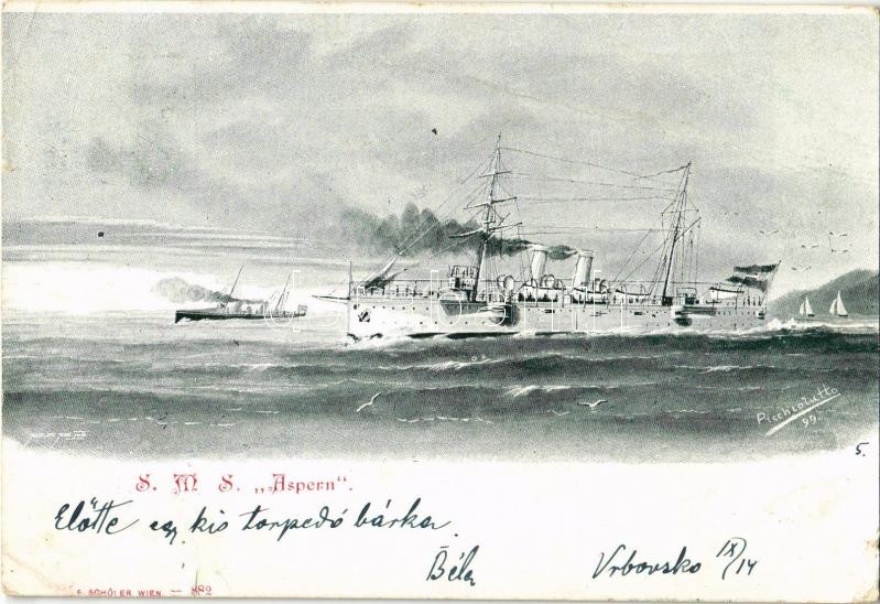 1900 SMS Aspern az Osztrák-Magyar Haditengerészet Zenta-osztályú védett cirkálója és előtte egy kis torpedóbárka / K.u.K. Kriegsmarine / Austro-Hungarian Navy Zenta-class protected cruiser. F. Schöler 882. (EK)