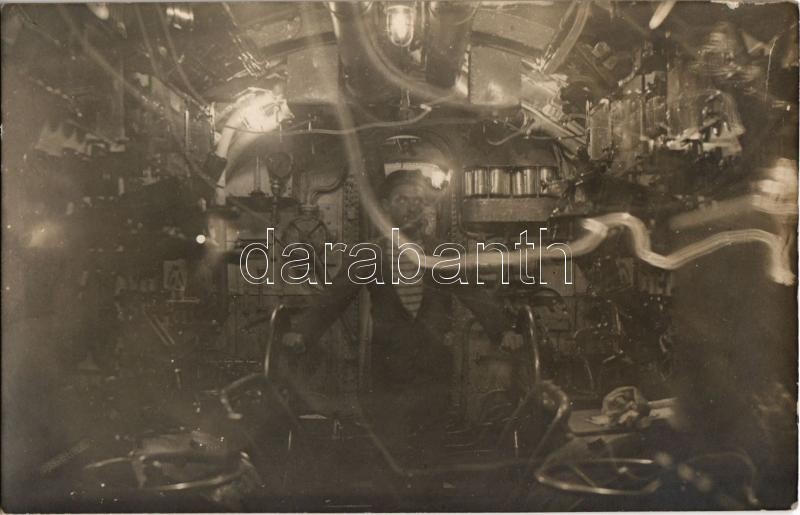 Osztrák-magyar haditengerészet tengeralattjárója, matróz az irányítókarokkal / K.u.K. Kriegsmarine Unterseeboot / Austro-Hungarian Navy submarine interior, mariner with control handles. photo