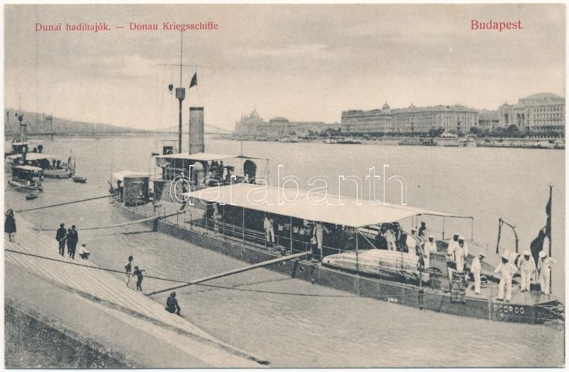 SMS Bodrog a Császári és Királyi Haditengerészet monitor típusú hadihajója, matrózok a fedélzeten. Dunaflottilla, Divald Károly 634-1909. / K.u.K. Kriegsmarine Donauflottille / WWI SMS "BODROG" Austro-Hungarian Navy river guard monitor, mariners. Danube Flotilla