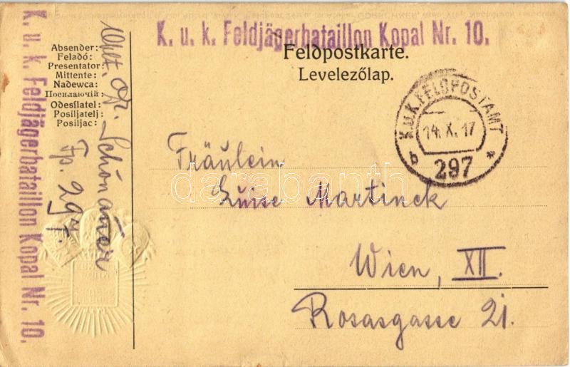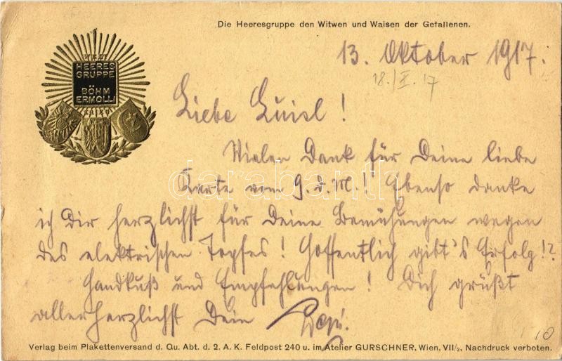 1917 Heeres Gruppe Böhm Ermolli. Weltkrieg. Die Heeresgruppe den Witwen- und Waisen der Gefallenen. Verlag beim Plakettenversand d. Qu. Abt. d. 2. A. K. Feldpost 240. / Böhm Ermolli Hadseregcsoport plakettjének képe tábori posta segélylapon / WWI K.u.K. Army Group Böhm-Ermolli, Austro-Hungarian military, picture of a plaque, Emb. Feldpostkarte + "K.u.K. Feldjägerbataillon Kopal Nr. 10." (EK)