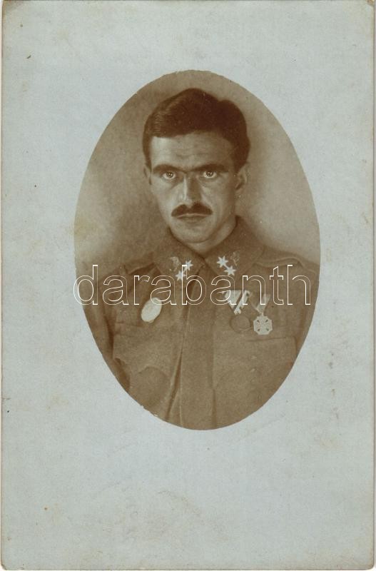 Beschreibung: 1917 Hufnagel Károly karpaszományos kitüntetésekkel / K.u.K. Kraftwagenkolonne Nr. 61. / WWI Austro-Hungarian military photo, soldier with medals (fl)