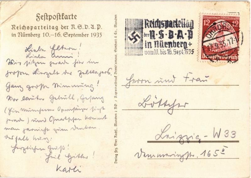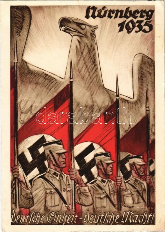 1935 Nürnberg, Deutsche Einheit - deutsche Macht! Feldpostkarte Reichsparteitag der NSDAP in Nürnberg / German unity - German power, NS (Nazi) propaganda art postcard + So. Stpl (EK)