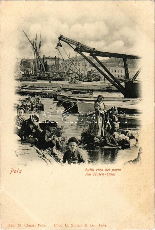Pola, Pula; gyerekek és ruhamosó asszonyok a kikötőben hajókkal / Sulla riva del porto / Am Hafen Quai / children and washerwomen at the post, ships. M. Clapis