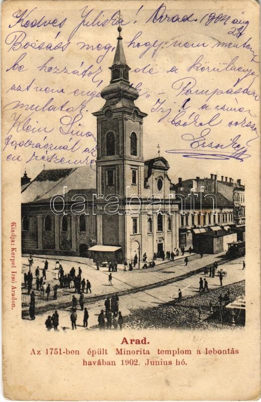 1904 Arad, Az 1751-ben épült Minorita templom a lebontás havában 1902.... https://www.darabanth.com/de/33-Gross-Auktion/33.1/Ansichtskarten/Siebenburgen~13901/1904-Arad-Az-1751-ben-epult-Minorita-templom-a-lebontas-havaban-1902-junius-ho-varosi-vasC3~II2142234
