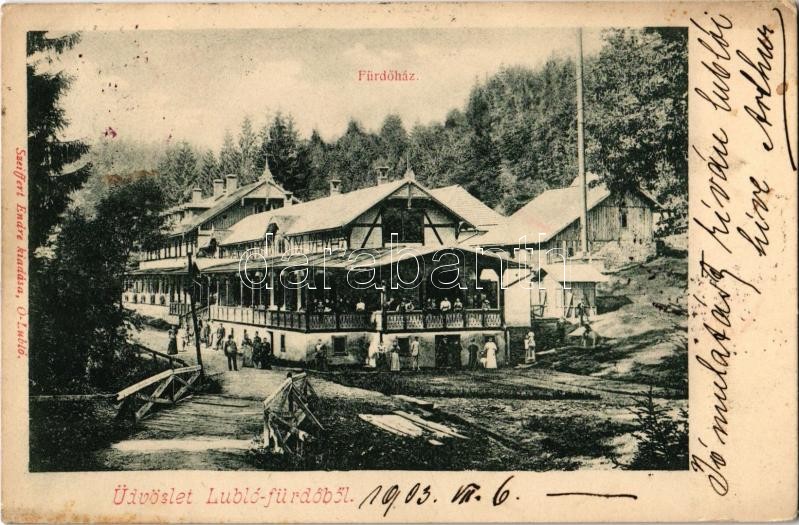 Beschreibung: 1903 Lublófüred, Lubló-fürdő, Kúpele Lubovna (Ólubló, Stará Lubovna); fürdőház. Szeiffert Endre kiadása / spa