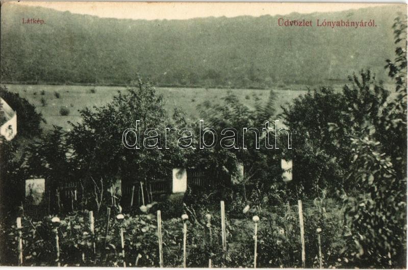 Beschreibung: 1906 Lónyabánya, Lovinobana; gyümölcsöskert. Özv. Szőllősiné kiadása / orchard (Rb)
