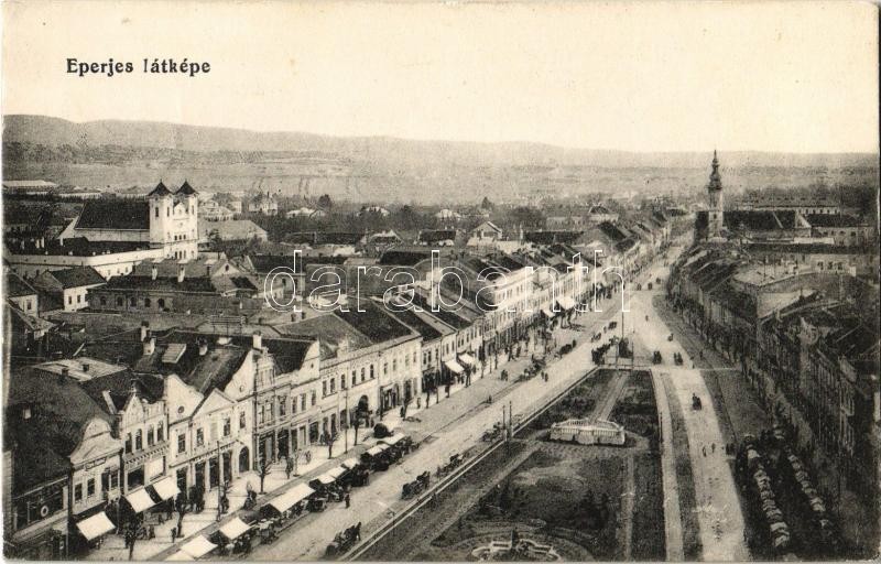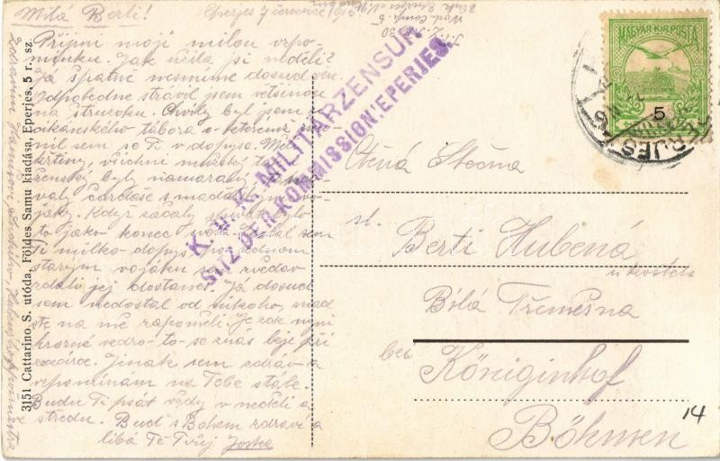 Eperjes, Presov; Fő utca, üzletek, piac. Cattarino S. utóda Földes Samu kiadása / main street, shops, market + "K.u.K. Militärzensur Sitz der Kommission: Eperjes"