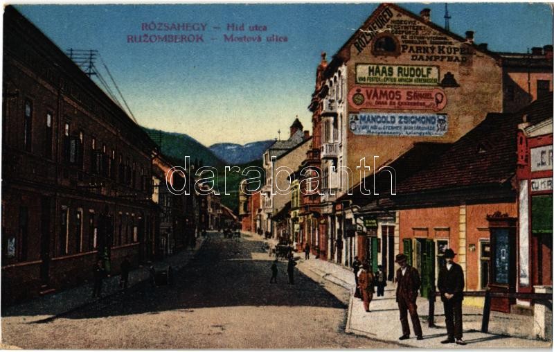 Rózsahegy, Ruzomberok; Híd utca, reklámplakátok (Rózsafüred gyógyfürdő, Haas Rudolf, Vámos Sámuel és Mangold Zsigmond üzlete), cukrászda. Valuch János kiadása / street, posters of shops, confectionery / Mostová ulica