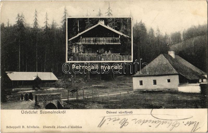 Beschreibung: Szomolnok, Schmölnitz, Smolník; Dénesi vámfürdő, Petrogalli nyaraló. Schoppell B. felvétele, Zbornák Józsefné kiadása / customs' spa and villa (EK)