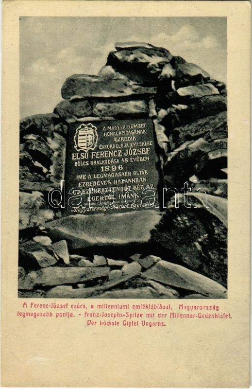Tátra, Magas Tátra, Vysoké Tatry; Ferenc József csúcs a millenniumi emléktáblával. Magyarország legmagasabb pontja. Kiadja Sima Antal / Stít Frantiska Jozefa (Gerlachovsky stít) / Franz-Josephs-Spitze mit der Millennar-Gedenktafel. Der höchste Gipfel Ungarns / Franz Joseph peak with the millennium memorial plaque
