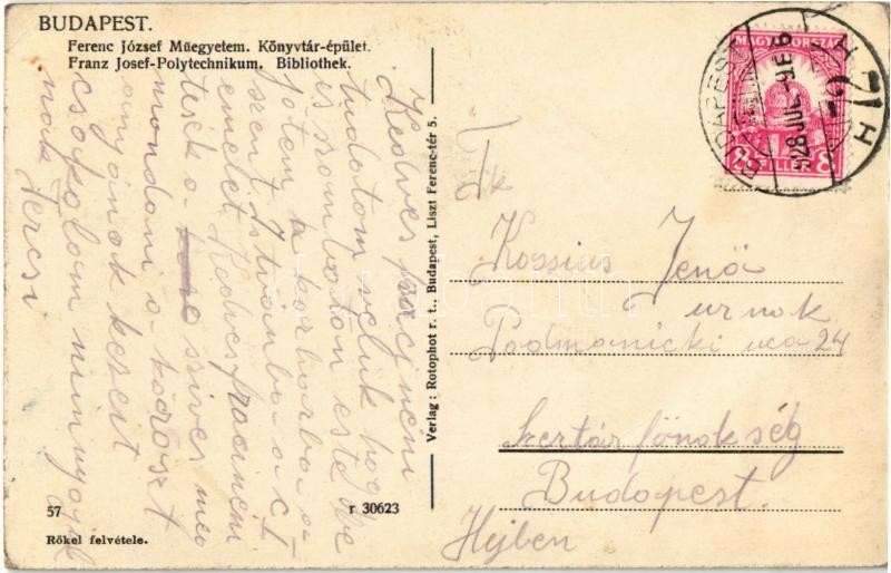 1928 Budapest XI. Ferenc József Műegyetem, Könyvtár épület. Rökel felv... https://www.darabanth.com/de/33-Gross-Auktion/33.1/Ansichtskarten/Ungarn~13900/1928-Budapest-XI-Ferenc-Jozsef-Muegyetem-Konyvtar-epulet-Rokel-felvetele-EK~II2134087