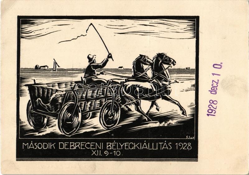 1928 Debrecen, Második Debreceni Bélyegkiállítás. fametszet + So. Stpl... https://www.darabanth.com/de/33-Gross-Auktion/33.1/Ansichtskarten/Ungarn~13900/1928-Debrecen-Masodik-Debreceni-Belyegkiallitas-fametszet-plus-So-Stpl-s-G-Szabo-Kalman-E~II2133696