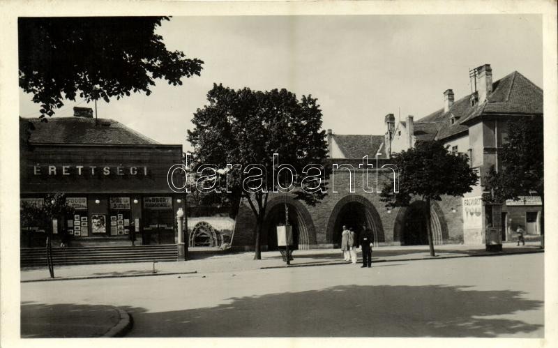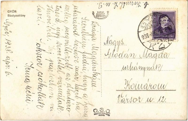 Beschreibung: 1938 Győr, Bástyasétány, "Elite" mozi, "Érettségi film plakát, fagylalt üzlet és Nővédő Egyesület (EK)