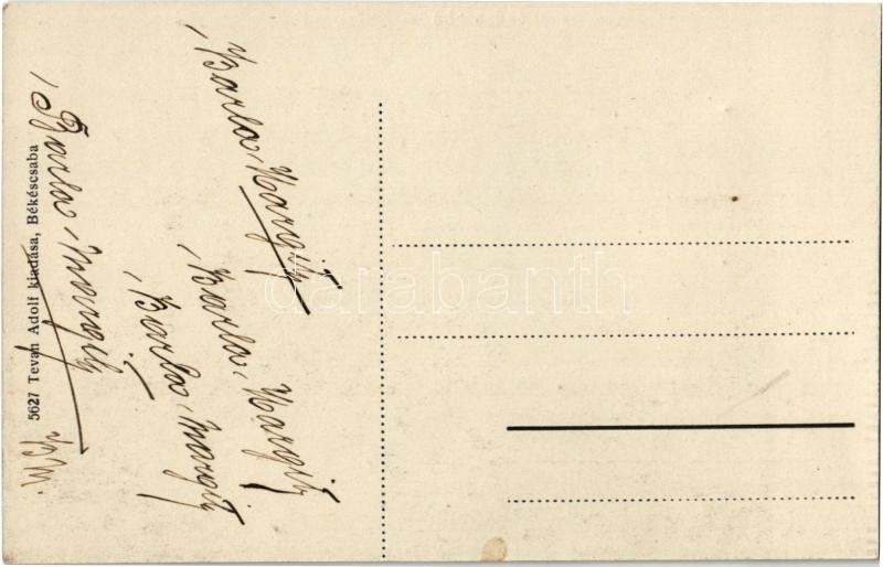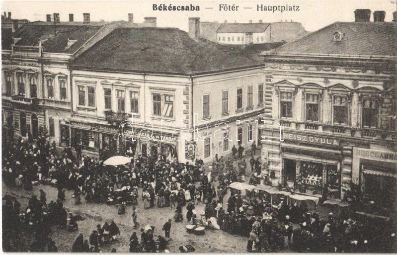 Beschreibung: Békéscsaba, Fő tér, Löwy Jakab és Társa, Leszich Kálmán, Kresmarik és Reisz Gyula üzlete, húscsarnok, piac, tömeg. Tevan Adolf kiadása