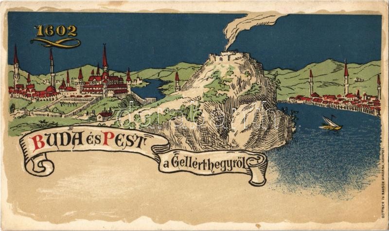 Beschreibung: Budapest anno 1602. Buda és Pest a Gellérthegyről. Geittner és Rausch kiadása, Art Nouveau litho