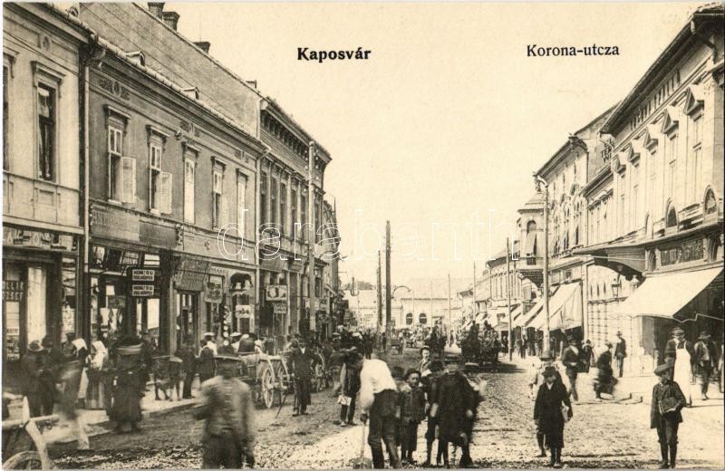 Beschreibung: Kaposvár, Korona utca és szálló, piac, Pollák József és Varga Miksa üzlete